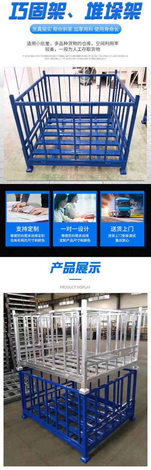 產(chǎn)品規(guī)格堆垛架,又叫巧固架、堆垛貨架,是從托盤衍生出來(lái)的搬運(yùn)、存儲(chǔ)設(shè)備,是貨物單元集裝、商品存儲(chǔ)與商品流通的多功能設(shè)備之一,需配合叉車使用。 堆垛架,可相互堆3到4層,形成立體存儲(chǔ)模式,無(wú)需借助貨架、倉(cāng)儲(chǔ)籠和托盤等設(shè)備,適合用在租賃倉(cāng)庫(kù)、低矮的老式倉(cāng)庫(kù)或車間暫存區(qū)等不適合投資貨架的區(qū)域。
